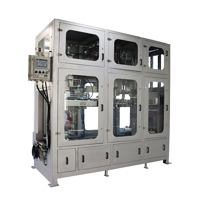 Тази машина е специално проектирана за интелигентна система за опаковане на химикали от 50-300 кг течен барабан, с отворен прозорец, автоматично повдигане и плъзгаща се врата, лесна за затваряне; Цялата линия може автоматично да пълни цевта, да отваря и затваря вратата, автоматично да идентифицира гърлото на цевта, автоматично да подравнява гърлото на цевта, автоматично да отваря капака, автоматично да пълни цевта, автоматично да завинтва капачката, да измерва изтичането и автоматично излизане от цевта.