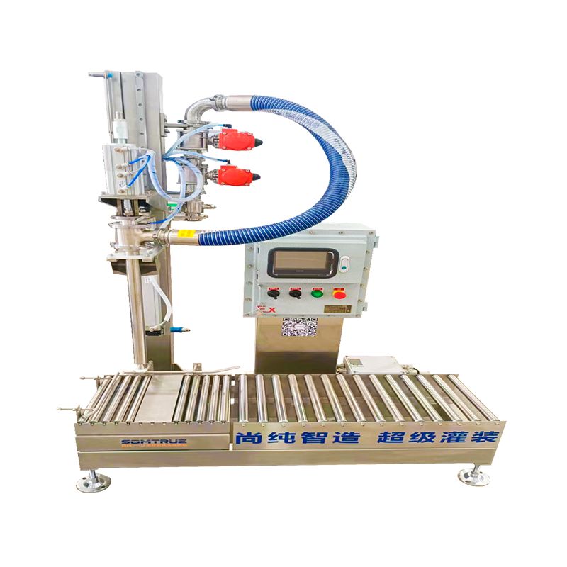 След като празният варел бъде доставен на място, започва пълненето с голям поток. Когато обемът на пълнене достигне целевия обем на грубо пълнене, големият дебит се затваря и започва пълненето с малък дебит. След достигане на целевата стойност на фино пълнене, тялото на клапана се затваря навреме. Това е често използвана опаковъчна машина за химически суровини.